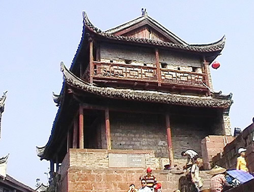東門城樓位于城東,緊靠沱江,原名"升恒門",為鳳凰古城四大城門之一。 東門城樓始建于清康熙五十四年(1715年),城門下部由紫紅砂巖砌成,上部城樓則用古磚砌筑。城門寬3.5米,高4米,呈半圓拱,兩扇城門都用鐵皮包裹,用圓頭鐵釘密釘,牢實堅固。城墻修筑全部用紅砂條石,精工細鉆,規(guī)格一致,城墻厚0.8米,下部內外兩側用條石加石灰漿砌成,中間填以碎石粘土,層層夯實;頂部的中間填充物改為石灰、鵝卵石、黃土拌成的三合土,厚約0.33米,上面鋪以紅砂塊石。城樓高11米,大門上方有槍眼8孔。歇山屋頂,覆以腰檐,飛檐翹角,精美壯觀。