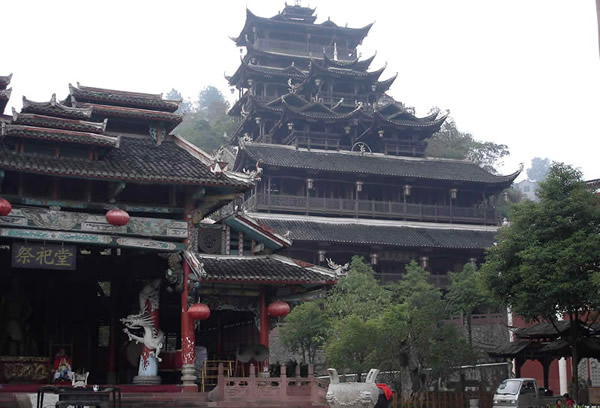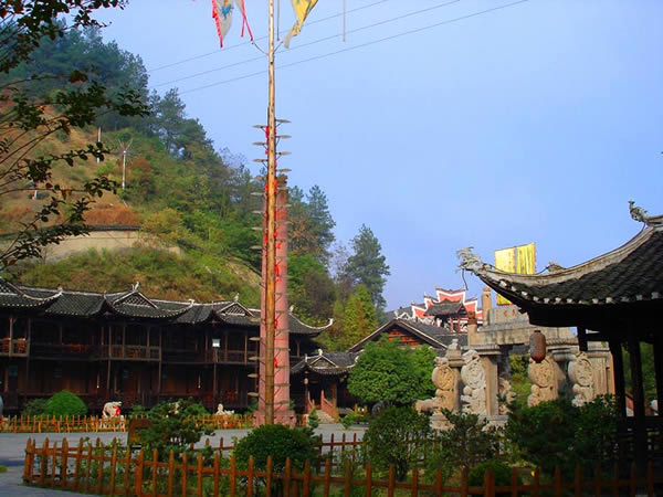 土司城 土司制度初建于五代十國時期,到了明朝己非常成熟了,土司王有無上的權威,在湘西有三大土司王分別是桑植土司向氏、永順土司王彭氏、慈利土司王張氏,其中又以永順溪州土司彭氏實力最強。其它土司王都為自己修建一座土司城,唯有彭氏分別在永定、永順修建了二座土司城。在永定的土司城內(nèi),彭氏為顯示其地位,修建了湘西最高的一座高達 48米,共12層的吊腳樓,整棟樓竟無一根鐵釘,堪稱土家吊腳樓建筑史上的奇跡,此樓于2002年9月被評為最高吊腳樓,榮獲世界吉尼斯之最,與此同時土司城內(nèi)舉辦一千人參加表演的毛古斯舞蹈活動獲得圓滿成功,同時獲得世界吉尼斯之最。進入土司城,首先看到土司城迎賓儀式,土家漢子迎賓鼓,吹牛角、放沖,土家姑娘攔門歌,敬攔門酒,進入城內(nèi),在祭祀堂前舉行百人土家大祭祖活動,男女老少唱擺手歌、跳擺手舞,登世界最高的吊腳樓九重天,參觀土家族千百年來文化展示。到土家山寨,聽土家歌,賞土家族最有代表風俗哭嫁,三棒鼓,花燈等民俗表演。