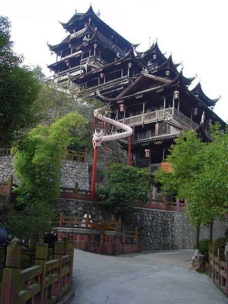九重天 九重天世襲堂是土家風情園的精華和靈魂所在。該建筑由土家民間藝人李宏進設計,依80度陡坡而建,高48米,共9重12層,整個樓房全部用木栓連接,沒有一顆鐵釘,堪稱土家族建筑史上的奇跡。2002年9 月22日,九重天吊腳樓被載入世界吉尼斯世界紀錄,認定其為目前中國最大、最高、最完美的木質結構吊腳樓。2001年4月6日,朱镕基總理視察土家風情園時,對九重天贊不絕口:“一批民間匠人能造出這樣輝煌的吊腳樓,而且還解決了力學的問題,真是不簡單。”清華大學著名建筑學家何重義先生說:“張家界土家風情園完全可以和蘇州的園林相媲美。特別是九重天世襲堂,猶如玉宇瓊閣,令人神往!”古人說,天有九野,地有九州,土有九山,山有九寨。古人又把九重叫做天,說天有九重,最上一重是上帝和君主居住的地方,所以我們叫它“九重天”。
