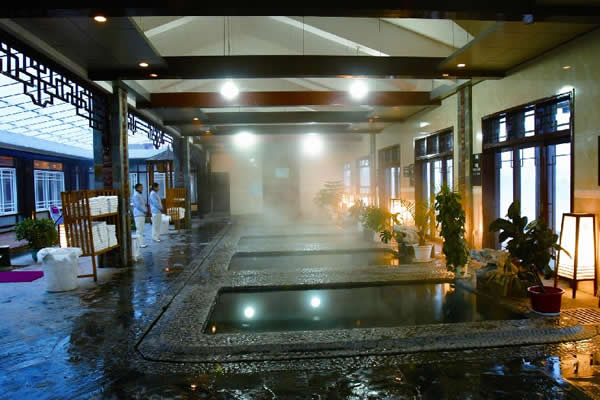 江埡溫泉主要硬件特色是高標(biāo)準(zhǔn)的自然園林式露天溫泉與室內(nèi)溫泉,建有同心池、六福湯、瀑布溫泉、石板溫泉、椰奶溫泉、花草溫泉、咖啡溫泉、紅酒溫泉等,布局體現(xiàn)出鄉(xiāng)土格調(diào),鵝卵石、青石板鋪地, 假山瀑布,小橋流水,20余種各賦特色、各具功能的溫泉池鑲嵌其中, 一派恬淡寧靜的詩情畫意。