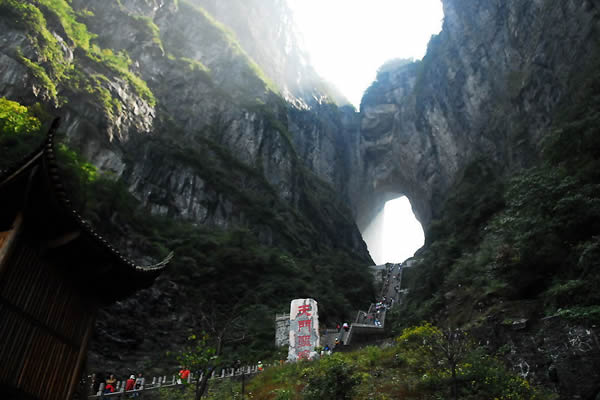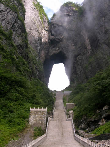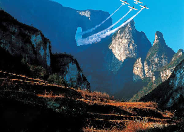 天門洞風(fēng)光圖片 天門洞景觀 1700多年來,這一道奇絕天下的勝景吸引著無數(shù)的探訪者趨之若鶩。特別是在1999年,世界特技飛行大師駕機(jī)穿越天門洞,在全球引發(fā)了轟動效應(yīng),收看現(xiàn)場直播的觀眾達(dá)到8億之多。
