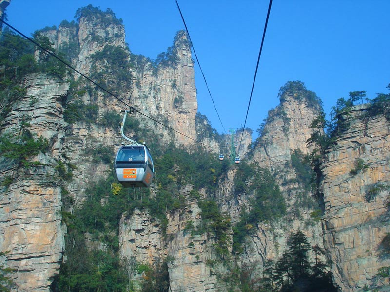 天子山索道 天子山索道的建成開通,極大地改善了武陵源風(fēng)景區(qū)的旅游交通環(huán)境,使游人花半日功夫上得天子山來只看一眼的遺憾,變成了間歇飛渡上山便可盡覽天子山這“擴(kuò)大的盆景,縮小的仙境”的迷人景色之享受。乘坐天子山索道,既舒適又安全,沿線風(fēng)光奇絕,奇松怪石,莽莽翠林,幽幽泉水,嬉戲獼猴,盡收眼底,令人嘆為觀止。尤其在云霧繚繞之時(shí),游客乘坐索道更能體驗(yàn)到神仙飄逸飛行的動(dòng)感與刺激。