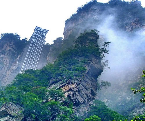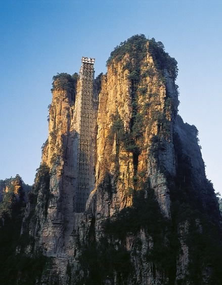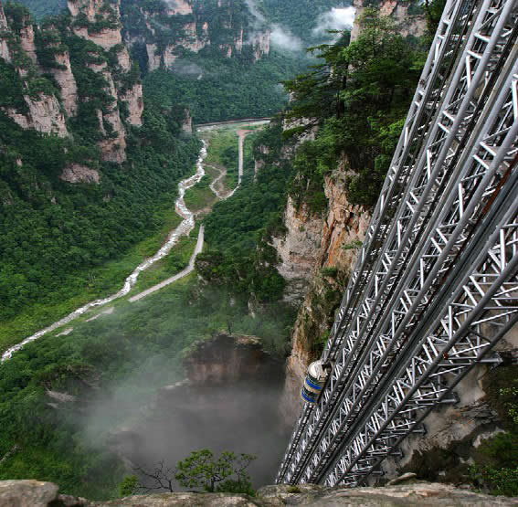 百龍電梯圖片 百龍?zhí)焯輾鈩莼趾辏怪备卟?35米,運行高度326米,由154米山體內堅井和172米貼山鋼結構井架等組成,采用三臺雙層全暴露觀光電梯并列分體運行,每臺次載客50人次,運行速度3米/秒,三臺同時運行每小時往返量達4000人次。百龍?zhí)焯莸男藿▽崿F(xiàn)“山上游,山下住”的目標,提供了交通保障,將袁家界天下第一橋、迷魂臺、天懸白練以及烏龍寨、楊家界等絕世美景從幕后推向了前臺,并將天子山、袁家界、金鞭溪等精品旅游線路連為一體,解決了多年困擾景區(qū)的交通瓶頸問題。