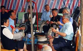 圍鼓(含嗩吶)。又稱打鎦子、打排鼓,是民間紅白會中不可缺少的樂器。一般7人演奏,樂器有一鼓、一大鑼、一公鑼、兩副鈸、兩嗩吶。其詞曲紅白會通用,以鼓和嗩吶上系紅、白布為分別標(biāo)記(結(jié)婚不打“四字鈸”曲)。史傳的圍鼓詞有《撩子》、《火鋪》等,《撩子》分《一二三》、《閃翅》、《堆羅漢》、《反落花》等十章,《火鋪》也分《三槍》、《四進(jìn)門》、《八哥洗澡》、《蓮魚吐絲》等十章,嗩吶詞有《八十正宮》調(diào)等。在農(nóng)村,圍鼓是最普及的樂器,每逢紅白喜事都有圍鼓和嗩吶表演。