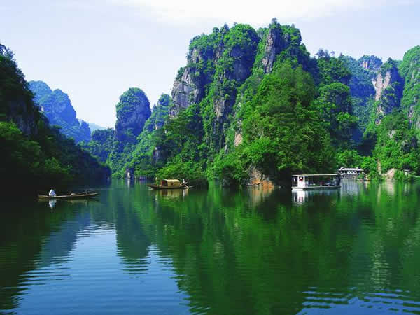寶峰湖瀑布 湖中有兩座疊翠小島,近岸奇峰屹立,峰回水轉(zhuǎn)。泛舟漫游,只見(jiàn)一湖綠水半湖倒影,充滿詩(shī)情畫意!霸铺萑f(wàn)丈上天臺(tái),高峽平湖一鑒開,王母瑤池金扶,浣沙仙女下凡來(lái)”游寶峰湖,你就會(huì)欣賞到這樣的詩(shī)情畫意。群峰擁抱的寶峰湖,長(zhǎng)約2.,5公里,湖猶如一面寶鏡,四面青山,一泓碧水,蕩槳溫游,格外愜意。坐在船上,環(huán)顧四周,千山聳翠,俯視水中,倒影慢移,碧水照相館得群峰綠,人面桃花水映紅。真是靜極了,美極了!韓劇《九天洞》拍攝的湖水就是寶峰湖。