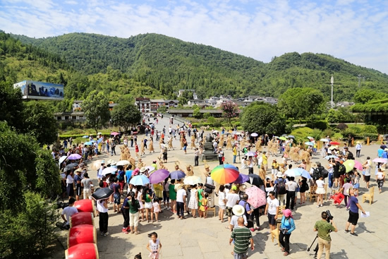 7月29日上午9點30分,由張家界市人民政府主辦,張家界市委宣傳部、市旅游和外事僑務(wù)委員會、市文體廣電新聞出版局、武陵源區(qū)人民政府承辦,黃龍洞景區(qū)協(xié)辦的“絕版張家界,最炫民族風(fēng)”張家界民俗活動月第三場活動在黃龍洞景區(qū)啟動。現(xiàn)場以土家人慶祝豐收的鼓舞拉開序幕,土家鼓舞歡悅的節(jié)奏,夸張的舞姿開場就吸引了幾千游人和當?shù)厝擞^看。草根夫妻檔歌手,張家界“山水組合許勇、舒維亮麗的服飾,野性的嗓音……”以一首《我在高山唱》歌曲,征服現(xiàn)場游客,贏得雷鳴般的叫好聲。